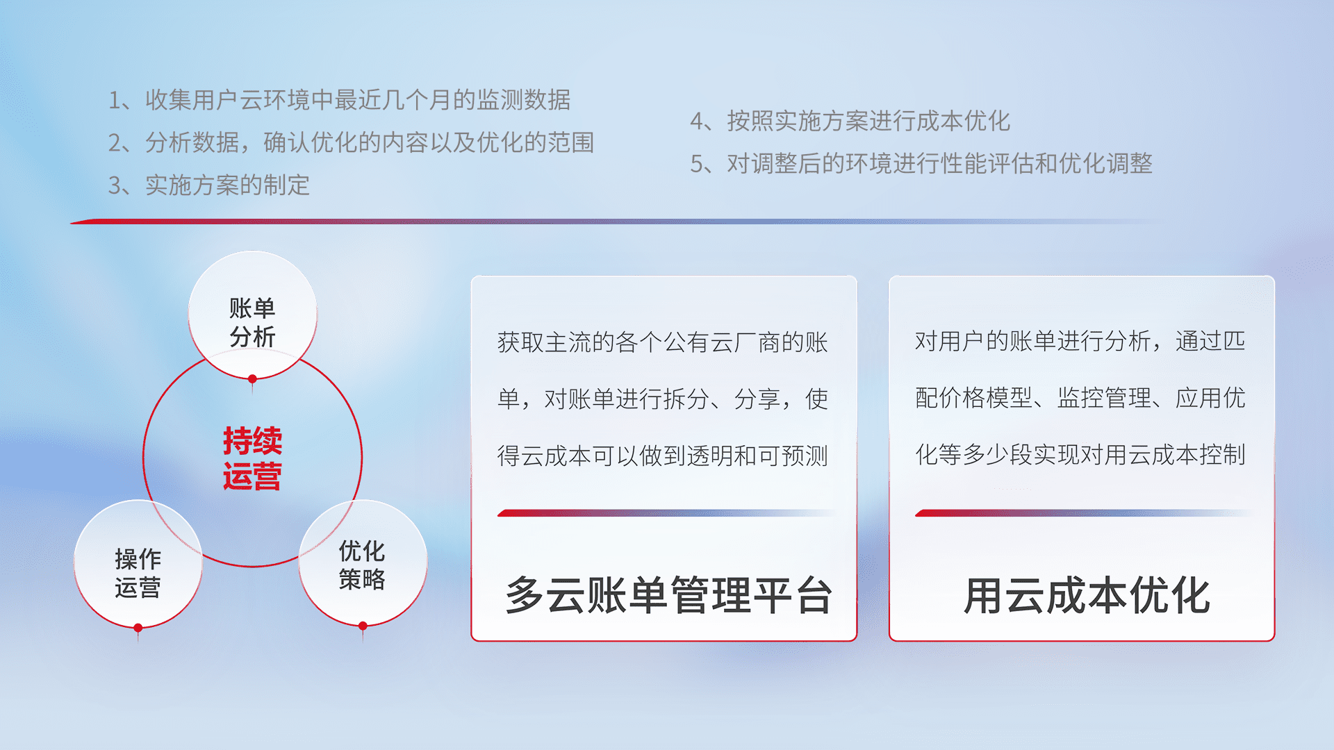 通过多云纳管,,以统一的资源数据模型把客户的云资源进行抽象和封装,,进而实现对多云资源的统一操作,,,保障云资源管理的可靠性、、稳定性与可用性。。。。量身定制化运维内容,,,,配置、、、开发运维、、、、补丁管理、、、、备份、、监控、、、、认证和访问管理、、、审计和日常巡检等,,保障在用云过程中的可靠度,,,,稳定度以及高可用率。。。。